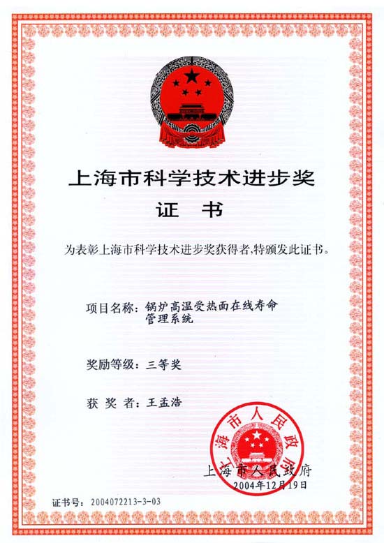 上海市 科學(xué)技術(shù)進(jìn)步獎(jiǎng)證書(shū) |